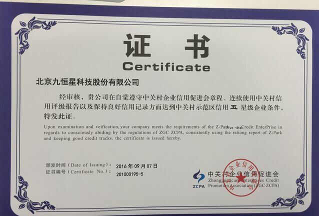 九恒星获“中关村示范区信用五星级企业”荣誉称号