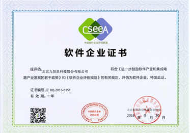 近日,北京九恒星科技股份有限公司在由“中国软件评估联盟”与“北京软件和信息服务协会的”联合实施的评定程序中,被认定完全符合《进一步鼓励软件产业和集成电路产业发展的若干政策》和《软件企业评估规范》的相关规定,拥有着合格的软件企业资质,并被再次授予软件企业资质证书。