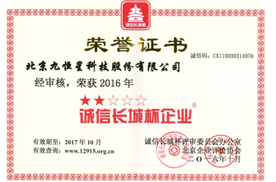近日,经北京企业评价协会综合评审、专家组联合审议,北京九恒星科技股份有限公司成为“2016年诚信长城杯创建企业”,即2015年后又一次获得此殊荣,良好信息已纳入北京市工商局《北京市企业信用信息网》进行查询。