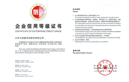 中国软件行业协会积极开展中国软件和信息服务业企业的信用评价工作,九恒星最终通过本次复评审核,这与公司多年来重视企业信用建设,建立一套完善的企业管理体系密不可分;这亦是中国软件行业协会对公司在企业信用建设方面的工作给予的充分肯定。“诚信、公正、创新、有序”是九恒星一贯奉行的经营理念,也正因为这种企业文化的牵引,九恒星一直致力于实现企业与社会、与员工的和谐发展、互利双赢。未来的九恒星将时刻以感恩、诚信、负责任来要求自己,助力维护诚信而公平的市场环境、促进中国资金信息及互联网软件信息技术行业健康而高效的发展。