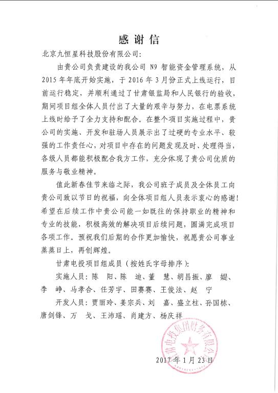 这封感谢信在很大程度上肯定了九恒星甘电投项目组在2016年的辛勤工作,这不但是客户对甘电投项目组的认可,更是对九恒星优质产品与服务的高度认可。九恒星会一如既往将“为客户提供优质的产品与咨询服务”作为经营宗旨,在服务好既有客户的基础上,创新出更多的优质产品。客户的认可,是九恒星最大的收获。