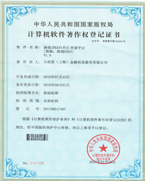 2017年1月,由九恒星全资子公司--九恒星(上海)金融信息服务有限公司研发的“换钱(FEAT)外汇申报平台V1.0”通过了国家版权的全部审核程序,获得了计算机软件著作权登记证书。