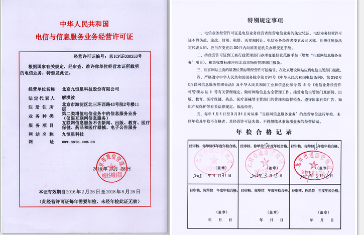 近期,北京九恒星科技股份有限公司再次顺利通过了中华人民共和国电信与信息服务业务经营许可证2016年度年检,这是自2008年参加ICP年检以来,连续第9年在互联网经营许可项目顺利通过审核。