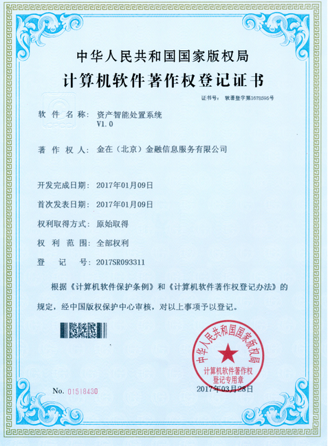 据悉,近日由金在(北京)金融信息服务有限公司研发的【资产智能处置系统V1.0】顺利通过了中国版权局版权保护中心的全部审核程序,获得了计算机软件著作权登记证书,此项认证是2017年度以来金在公司产品序列中又一核心产品获得的重要资质证明。由此可见,金在公司的业务领域及产品布局正日趋完善,更多符合用户需求及应用趋势的优秀产品不断涌现,凭借着产品及服务的良好表现,金在公司已经获得了越来越多的来自市场与用户的关注与好评。