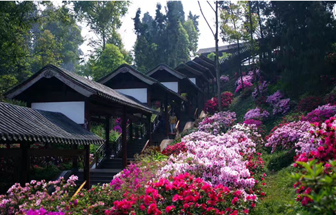 沿着杜鹃长廊拾阶而上,亭台楼阁间花香飘逸。走完杜鹃长廊到达午餐地点—云海餐厅,此时饭菜已上桌,大家举杯共饮,菜香与花香,味觉与视觉,让人身心愉悦。
