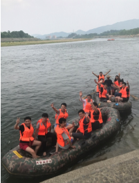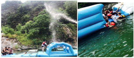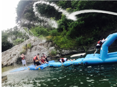 大家顶着高压水枪的冲击和湿滑的气垫,同舟共济,在水上冲关中大家寻找合作的黄金点,不断形成一种默契,这种关系由原来松散的个体磨合成为一个能够冲破任何防线的组合体,在如瀑布般的水流面前无所畏惧,一次次的落水大家没有气馁,齐心协力,最终到达了胜利的彼岸。