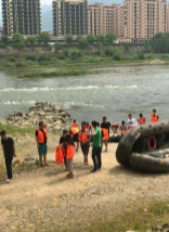 伴着夕阳西下,进展到了最后一个也是最紧张刺激的水上拓展活动。大家都跃跃欲试换好救生衣,一个个冲进水池。