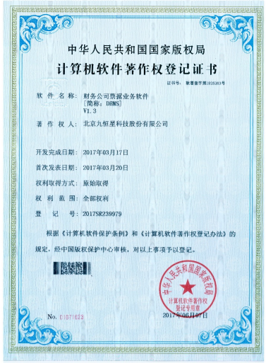 近日,北京九恒星科技股份有限公司自主研发的【财务公司票据业务软件V1.3】通过了中国版权局版权保护中心的全部审核程序,获得了计算机软件著作权登记证书。九恒星多年来专注的企业资金管理领域符合市场需求和国家产业政策的发展,且在不断打磨优化产品的同时受到社会各界的一致好评。