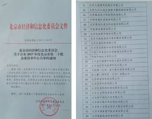 北京九恒星科技股份有限公司荣获 “北京市企业技术中心认定”