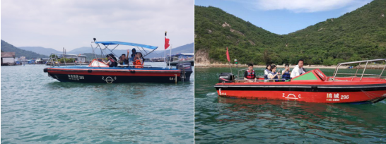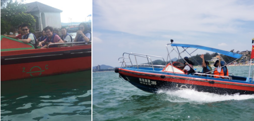 在海风的滋润下,我们度过了在较场尾的第一个夜晚。思凯的小伙伴们还有探险的精神,第二天要去坐一次快艇借机亲近大海。管理人员给我们穿上桔黄色的救身衣,有些女生们是第一次坐快艇,刚上船的时候有些害怕,男生们便坐在女生后面保驾护航,刚坐稳,快艇像箭一样地向湖中心驶去,在海面上翱翔。