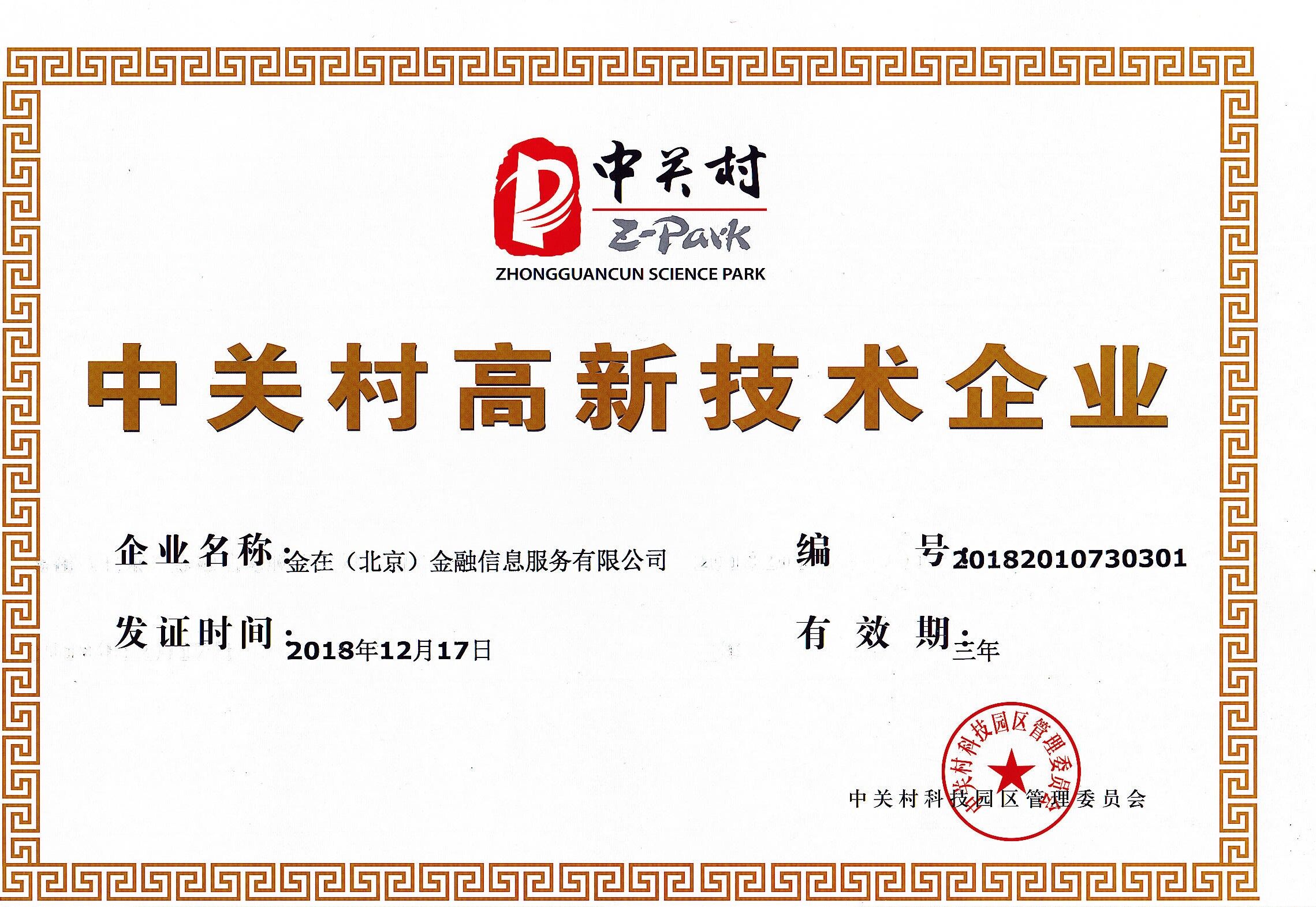 2018年12月,金在(北京)金融信息服务有限公司(简称”金在金服“)经过企业申报、专家审查、园区验核、结果公示等一系列流程步骤,由中关村科技园区管理委员会最终审核批准,荣获了“中关村高新技术企业”证书。