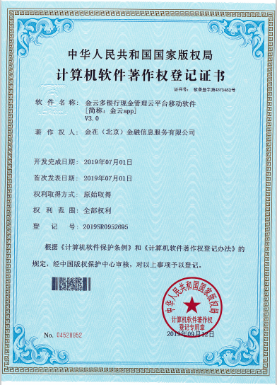 随着科技金融的快速发展,技术创新能力对企业的发展显得尤为重要,为此,北京九恒星科技股份有限公司也加快了在技术体系上的布局。据了解,九恒星子公司金在(北京)金融信息服务有限公司[简称:金在金服]陆续向中国版权保护中心申报计算机软件项目,根据《计算机软件著作权登记办法》规定,金在金服自主研发的金云多银行现金管理云平台移动软件【简称:金云APP】V3.0 、银银通管理平台【简称:cnswift】V5.0 、多银行财资管理系统V4.0等三项计算机软件产品经权威部门严格审核与评定后,各项指标均达到软件产品登记测试规范要求,并于近日悉数颁发证书。