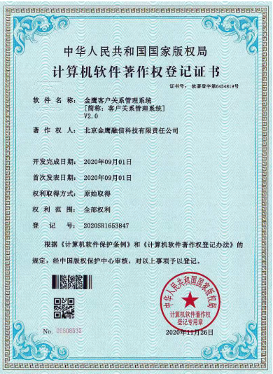 根据《计算机软件保护条例》和《计算机软件著作权登记办法》的规定,经中国版权保护中心审核,中华人民共和国国家版权局对金鹰融信科技有限责任公司的“金鹰客户关系管理系统”产品颁发软件登记证书,从颁证之日起,版权将得到中国版权保护中心的有效保护。同时,这也是金鹰融信在技术创新方面取得的又一成果。