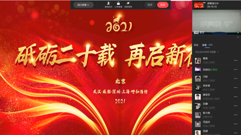 仰首是春,俯首为秋,2021年2月1日,在农历辛丑牛年即将来临之际,北京九恒星科技股份有限公司以“砥砺二十载 再起新征程”为主题的线上工作总结及表彰会隆重召开。由于疫情的原因,今年公司年会改变形式,简化内容,采用了企业微信线上直播的方式进行。