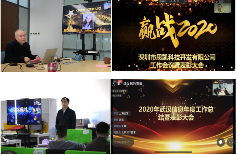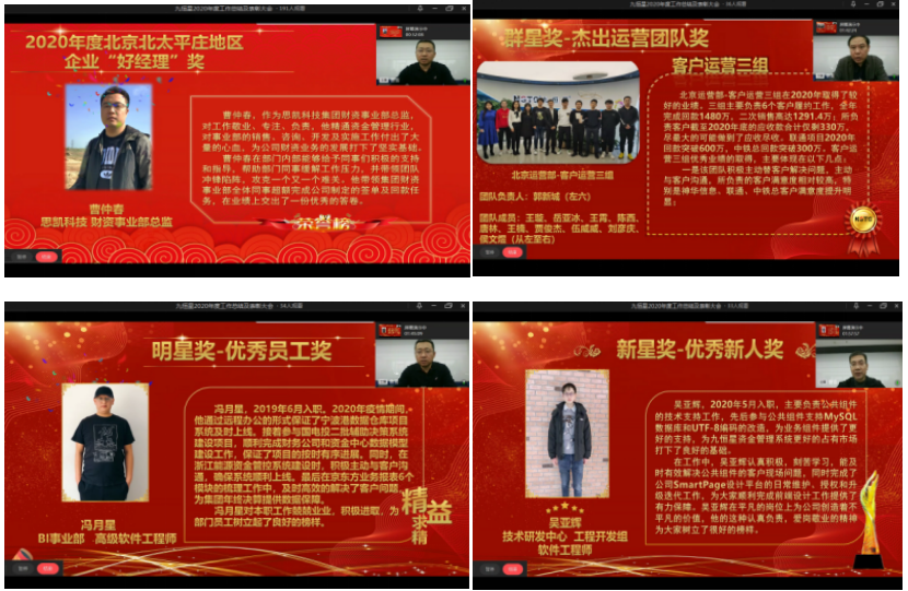 总结表彰会分为上半场和下半场,上半场由九恒星公司统一组织召开,以总结、表彰、优秀获奖代表分享为主线进行,各公司、各业务单元以及在项目现场工作的员工、出差的员工利用电脑端、手机端全程参会观看;下半场由九恒星及各下属公司自行进行总结,并将评选出的优秀团队及个人的业绩给各自公司全员进行详细的介绍和表彰。这是疫情之下,九恒星人凝心聚力、回顾过去、展望来年的总结和期盼。这次极为特殊的线上表彰总结会,虽然因防疫要求产生了空间的距离,但通过直播,700余名九恒星人在一张张屏幕下实现了线上的团聚。